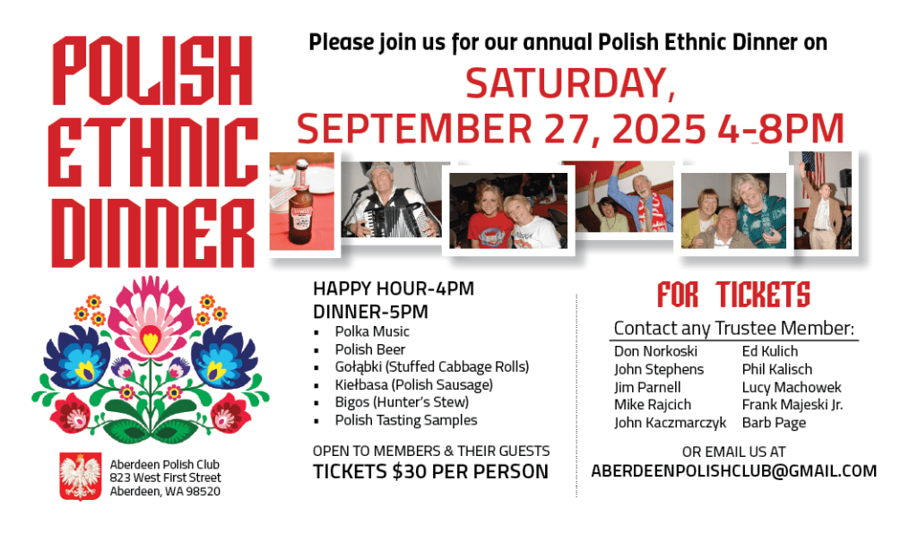 Contact Don Norkoski to reserve your seats at (360) 581-5806 or email the Polish Club at aberdeenpolishclub@gmail.com.